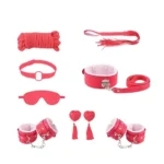 Turn your fantasies into reality with this 8-piece BDSM bondage kit. It includes 2 sets of sexy handcuffs, a night eye mask, nipple covers, a faux leather whip, bondage rope, a ring gag, and a collar with leash. Color sent randomly.